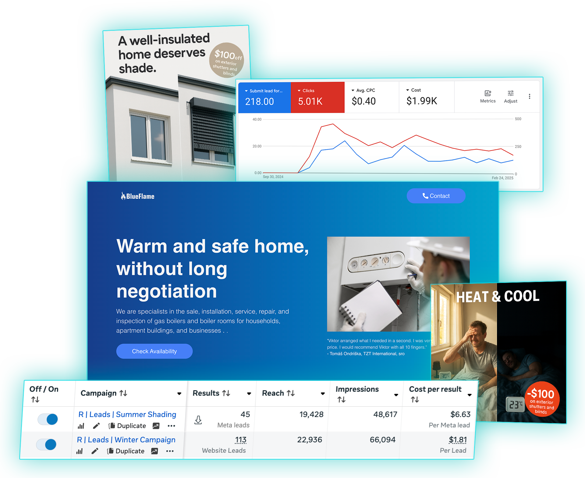 We don’t guess, everything is data-driven. Before launching, we analyze your market, competitors, and past efforts. Then we build a funnel tailored to your services so that leads translate into booked jobs.